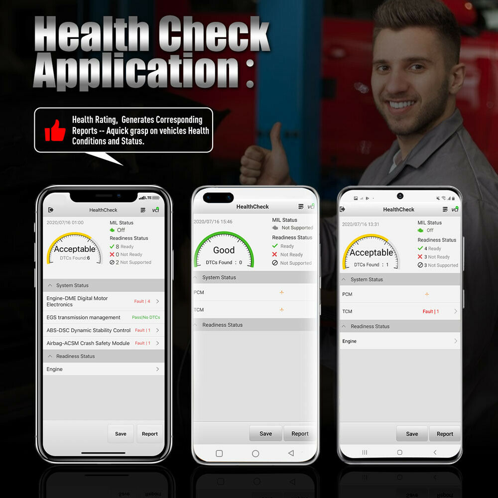 • The AP200H provides a snapshot of the vehicle's health and generates a health report.With this function, you can know health rating, generate corresponding reports, and gain a quick grasp on vehicle health condition and status. Comparison: Software Purchases:1 Year Warranty with 45-Day Replacement & In-APP The MaxiAP AP200H is used to connect to the vehicle's OBDII port and connect with an Android or iOS device for intensive health reports.
