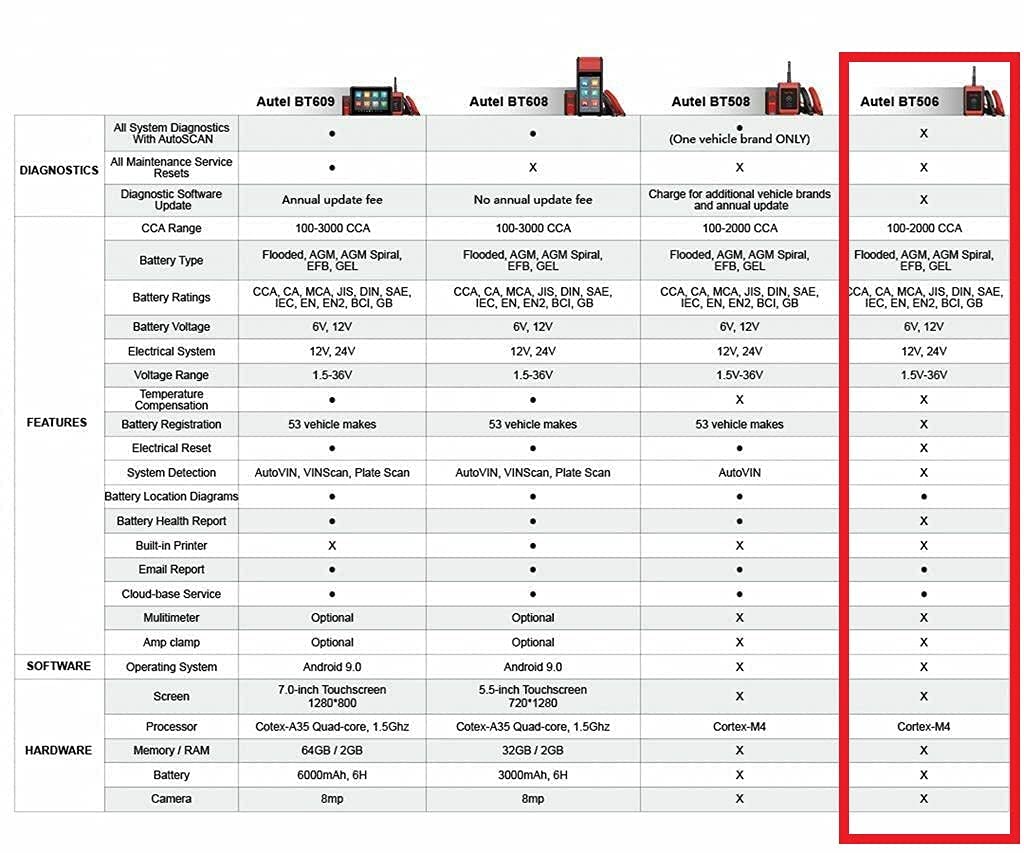 Autel MaxiBAS BT506 can works with 95% Autel diagnostic tablet for detailed vehicle battery, cranking, startor and generator tests, such as: Autel MK808BT, MP808BT, MS906BT, MK906BT, MS906TS, MS906 Pro, MS906 Pro-TS, MK906 Pro-TS, MK908, MK908P, MS908S Pro, Elite, Elite 2, MS909, MS919, Ultra Lite, Ultra