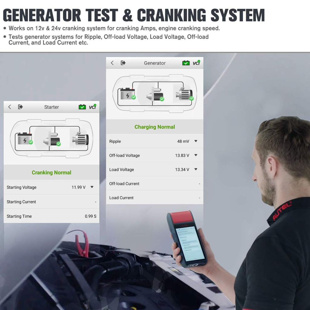 👏[CRANKING AND CHARGING SYSTEM TEST]👏Autel battery tester MaxiBAS BT608 performs complete cranking and charging diagnosis on 12V & 24V passenger in-vehicle and out-of-vehicle systems. Cranking and charging diagnostics offers all-round battery diagnostics including starting voltage, starting current, starting time, engine cranking speed, cranking Amps, generator status... These test results will display on the screen and quickly determine the operating status of the cranking and charging system.