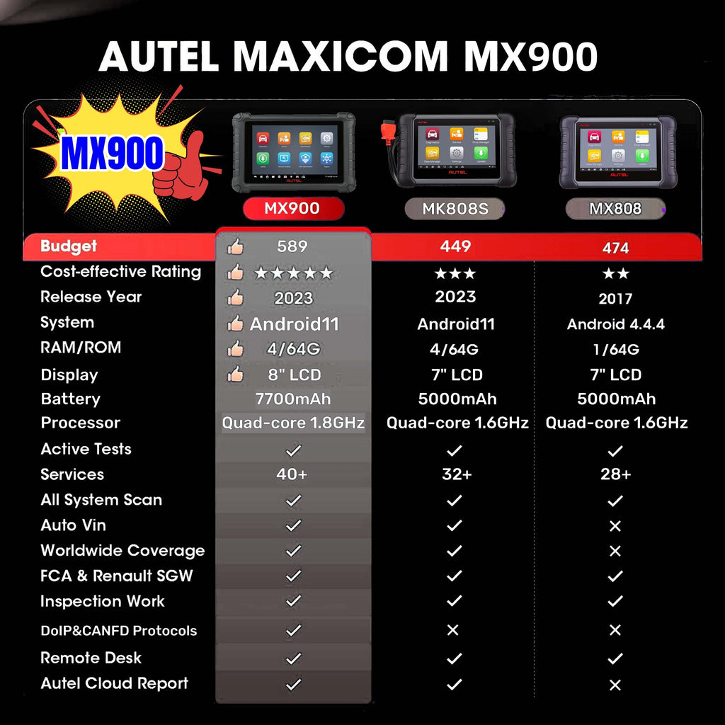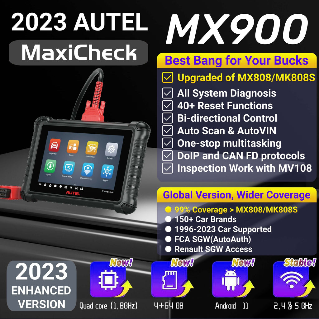 💫[ Upgrade of autel MX808/MK808 ]💫 Autel's latest release, the AUTEL MaxiChek MX900 running on Android 11, is the latest base model scan tool, intended as a replacement for their popular MX808. ❄️The MX900 improves over the MX808 by bringing a longer battery life, enhanced memory (both operating and internal storage), as well as a more powerful and faster processor. ❄️The MX900 runs on Android 11 and is powered by 1.8 GHZ processor. Includes one year of software updates a limited warranty.