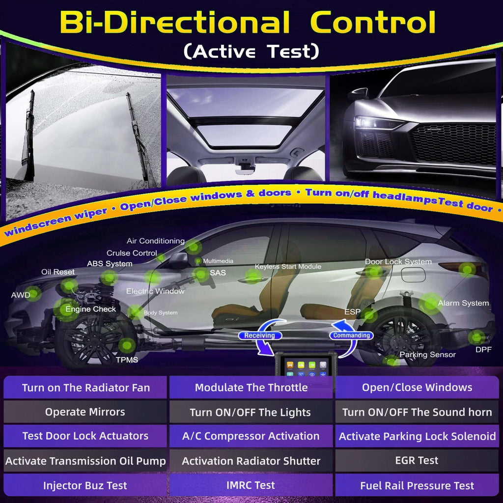 💫[ Active Test/Bi-directional Control ]💫 With the MX900, you can perform real active tests that send commands to the vehicle's ECU, enabling the actuators to work accordingly. ✨Examples of active tests include Injector tests, headlamp and fuel pump control, A/C cycling, clutch activation, Oil Pressure Test, Vehicle level position calibration, Brake Vacuum Pump, Inlet, and Outlet Valve tests, door and sunroof controls, among others. These tests help quickly identify faulty parts.