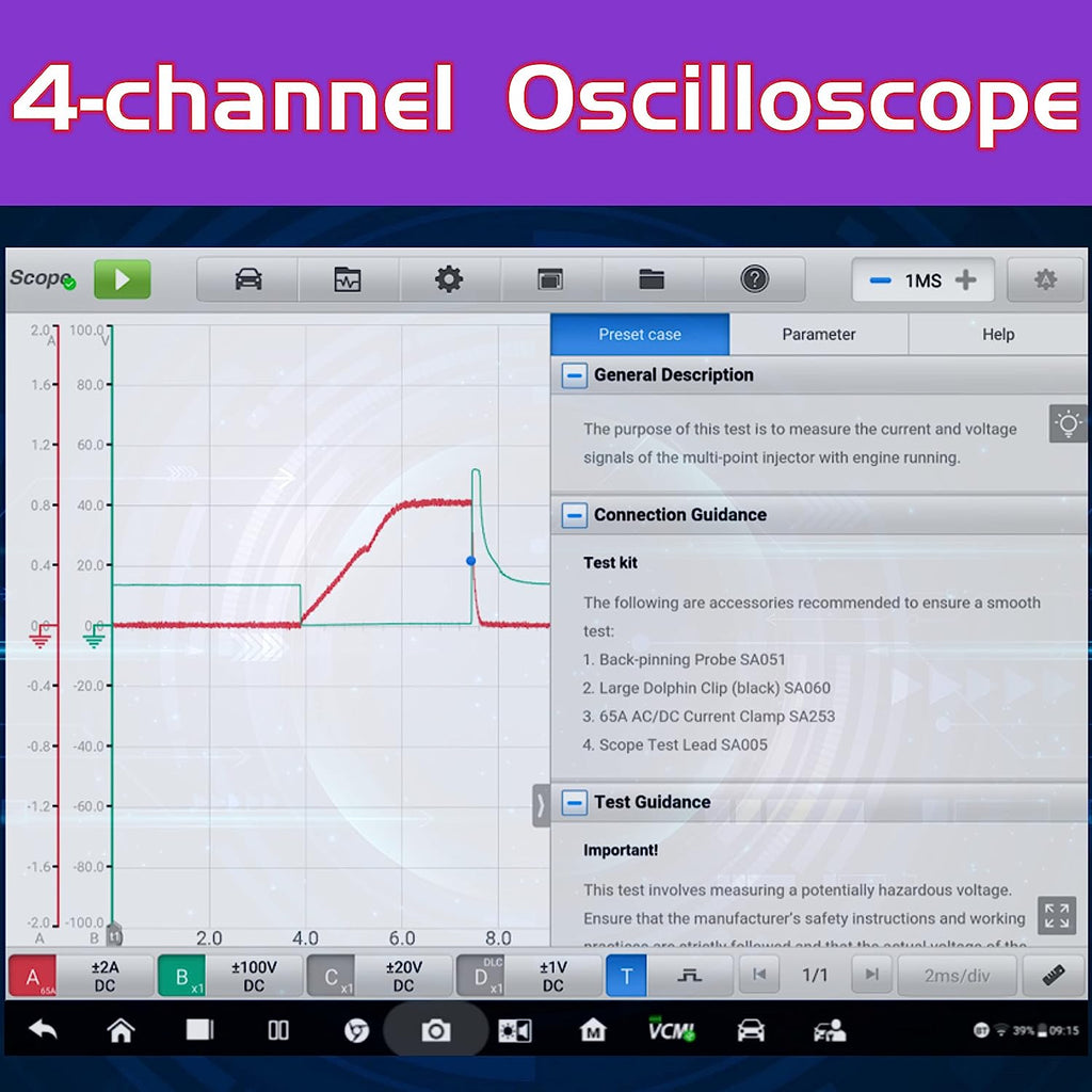 The VCMI 4-channel oscilloscope component of the system offers a range of features and capabilities that are tailored to automotive diagnostics. It has a high sampling rate and bandwidth, allowing it to accurately capture fast-changing signals and waveform shapes. It also comes with a range of preset automotive waveform templates, making it easy to diagnose specific vehicle issues such as misfires, fuel delivery problems, and ignition faults.