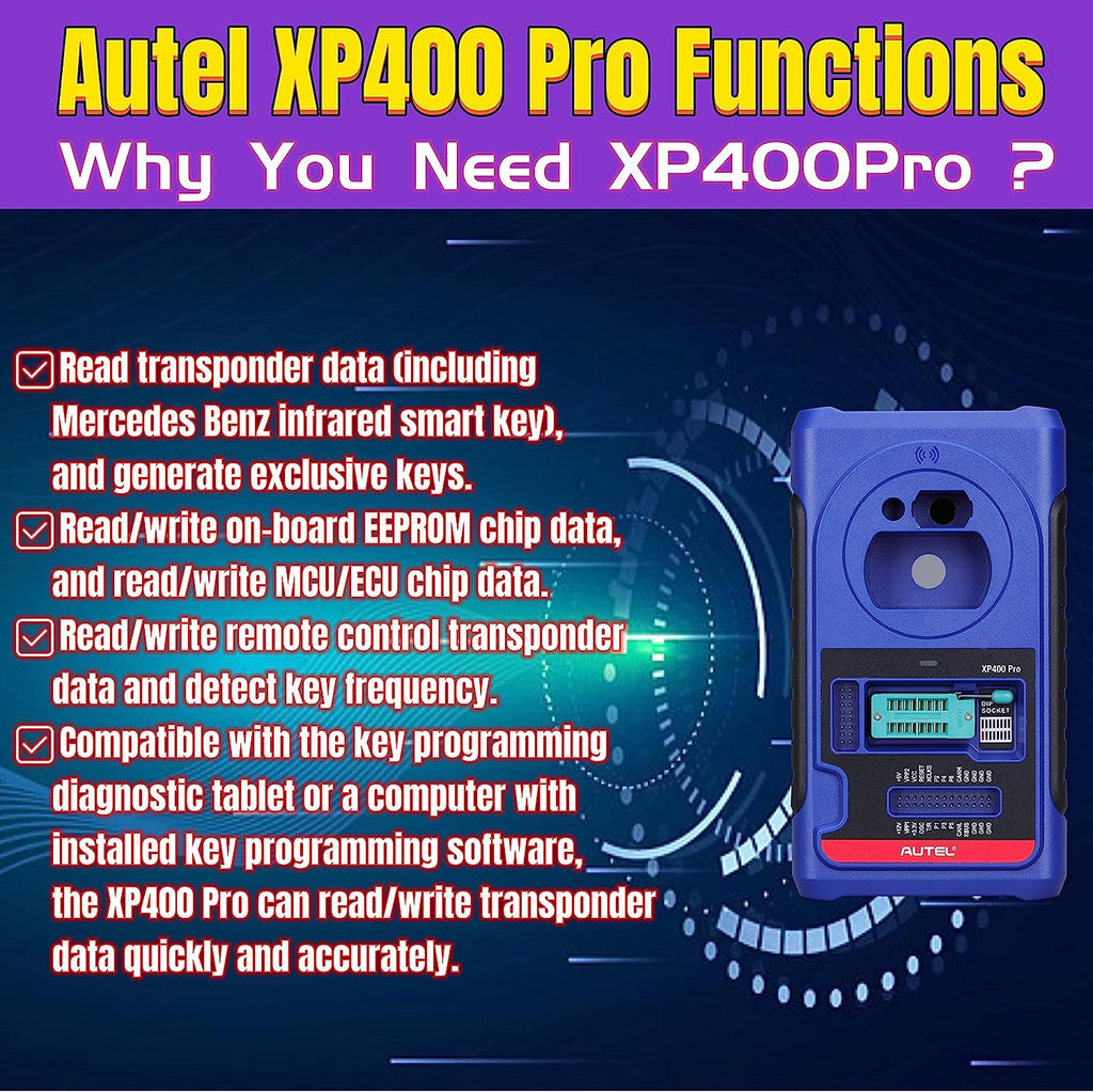 The XP400Pro key and chip programmer, compatible with the IM508 and IM608, reads/writes and learns keys to the vehicle. The XP400 Pro is an upgrade of the XP400, Which enables programming of infrared keys for Mercedes vehicles and IC Chip keys on late model Hyundai KIA vehicles. The XP400 also performs EEPROM-data functions needed for European vehicles. The XP400Pro supports Data Read/Write of 3,000 Plus Chip Types (inc. EEPROM, engine ECU, MCU, IMMO ECU).Also, added functions for EWS3, W209, NEC, and more.