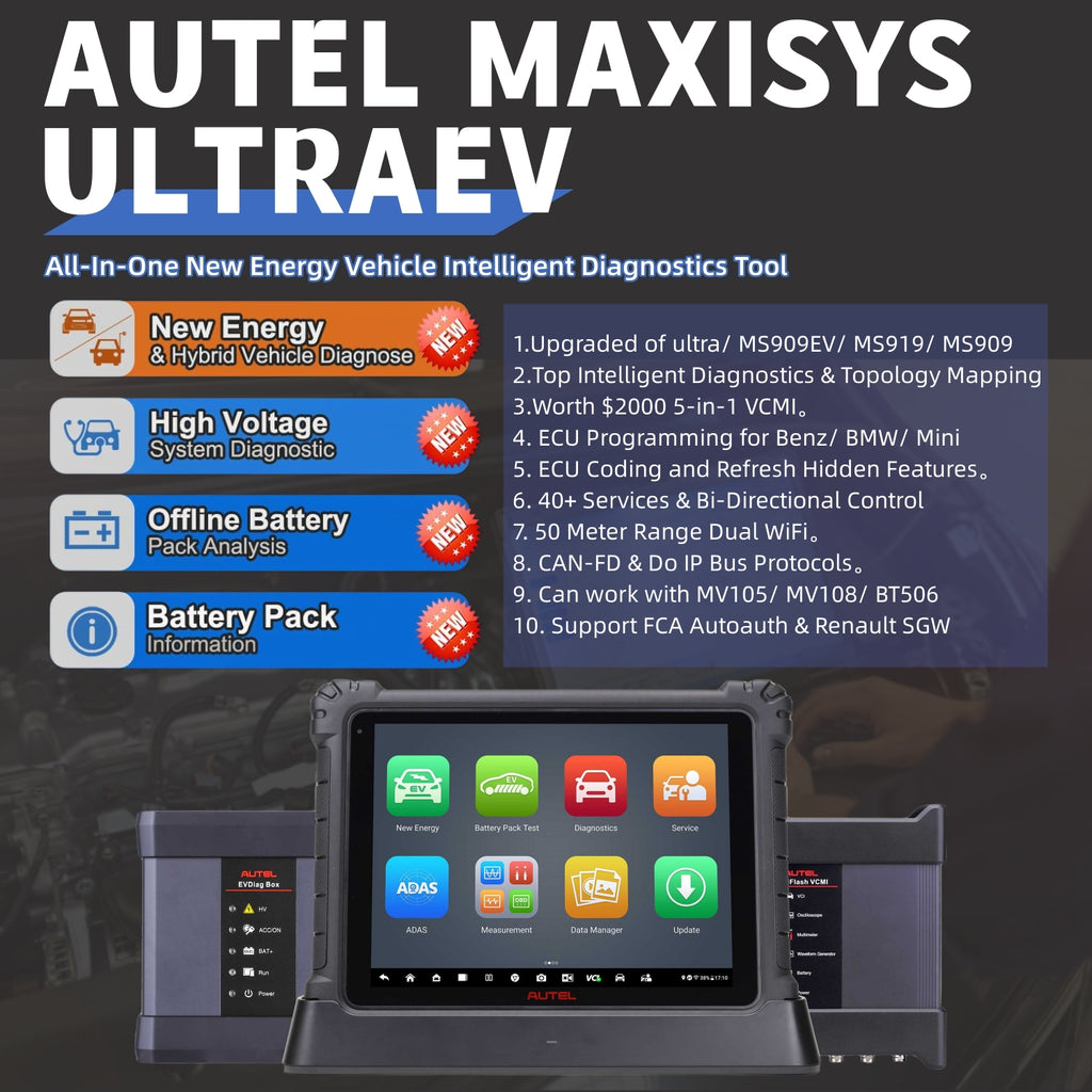 🏆AUTEL MAXISYS UltraEV 🏆:The Autel MaxiSys Ultra EV is a new generation of intelligent diagnostics for electric, hybrid, gas vehicles. The Autel MaxiSYS Sanner Ultra EV provides a comprehensive analysis of electric and hybrid vehicles with expanded topology mapping and battery pack analysis . The 12.9-inch touchscreen tablet comes equipped with MaxiFlash VCMI (5-in-1) measurement device, Bluetooth-enabled vehicle communication interface and J2534 pass-thru programming device, and a dedicated EVDiag box.