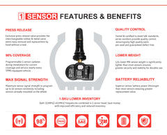 315MHZ & 433MHZ 2in1 This tire pressure monitoring sensor (for TPMS) has been manufactured to combine both 315 MHz and 433 MHz applications in one sensor to greatly simplify users' inventory management and lower the investment as well as sales loss. And it is built to perform like OE sensors in terms of signal durability and functionality. Exclusive Press Release Interchangable Valve Stems The patented press release valve design allows interchangeable rubber and metal valves to be easily replaced in the same sensor head by hand with no valve fitting tool required. Simply click in and press out. Installing TPMS sensors has never been so easy.
