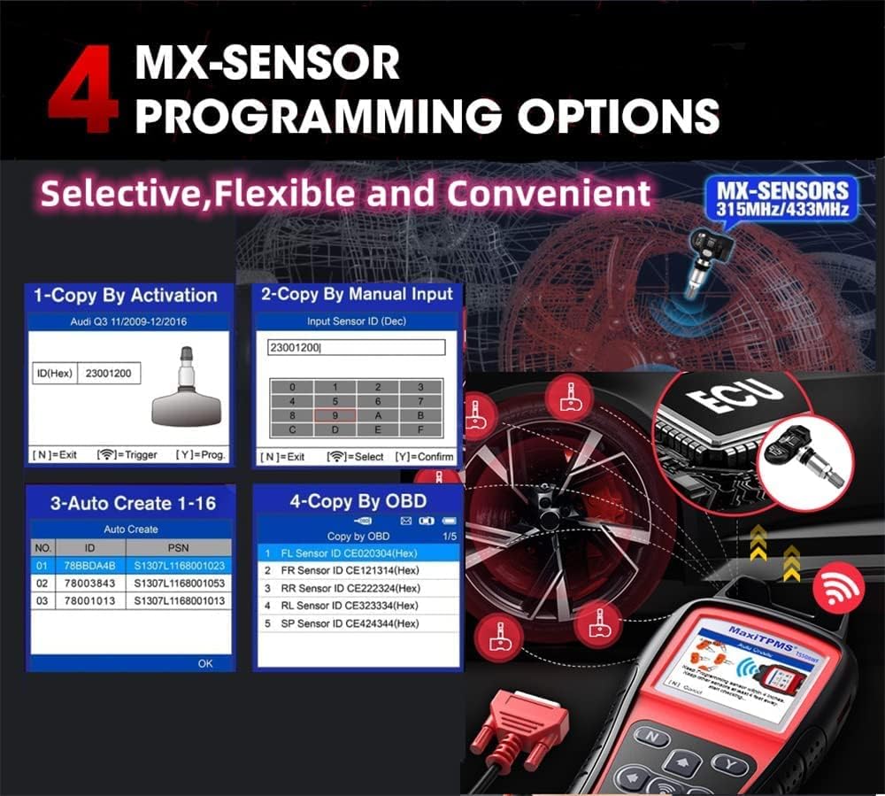This TPMS programming tool allows 4 simple ways to program MX-sensors quite easily: