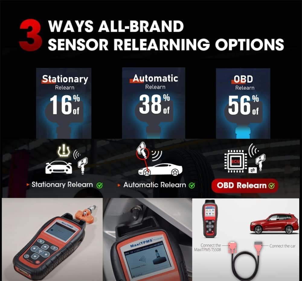 - Automatic Relearn (compatible with Ben-z, BM-W, Maserati, Porsche, Bentley, Chrysler, Fiat, VW, Land Rover, and Jaguar models which have the automatic sensor-relearn system) This TPMS reset tool MaxiTPMS TS508wf provides an easy relearn guide to simplify the auto-relearn process. You can follow the instruction to trigger sensors first, drive the car for at least 20 minutes and the relearn will automatically get done.