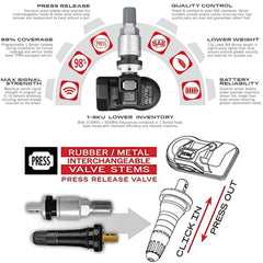 This tire pressure monitoring sensor (for TPMS) has been manufactured to combine both 315 MHz and 433 MHz applications in one sensor to greatly simplify users' inventory management and lower the investment as well as sales loss. And it is built to perform like OE sensors in terms of signal durability and functionality.